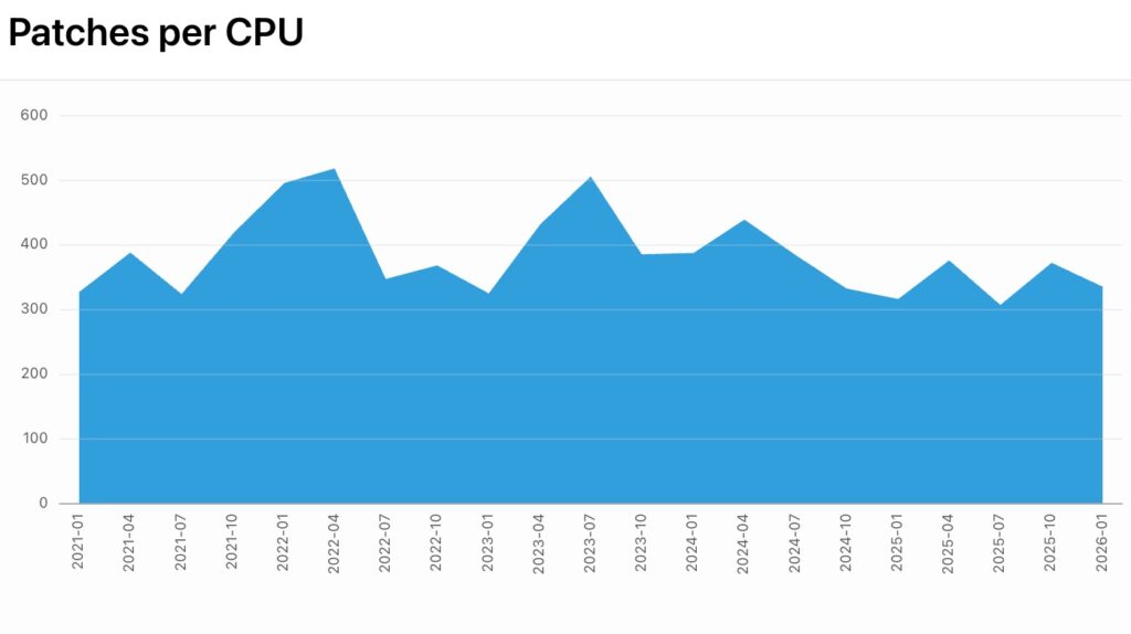 Mit 337 Patches für insgesamt 122 Produkte sind es etwa 10% weniger Bugfixes als im vergangenen Oktober (374 für 131 Produkte). Seit Juli 2024 bewegt sich die Gesamtzahl der Patches zwischen 300 und 400 Patches pro CPU.
